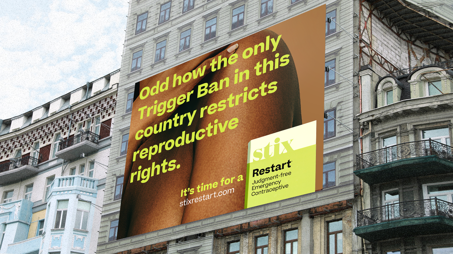 Stix is a female health startup, and to help launch their new morning-after pill called “Restart,” we took a progressive stance during a pivotal time - the Roe reversal. Our goal was to pick apart the absurd realities of other laws juxtaposed to the fact reproductive rights are slowly being stripped away. These provocative OOH boards were purposely placed next to anti-abortion clinics in key trigger states.